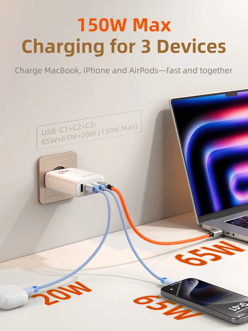 • 3 מכשירים: 65W + 65W + 20W