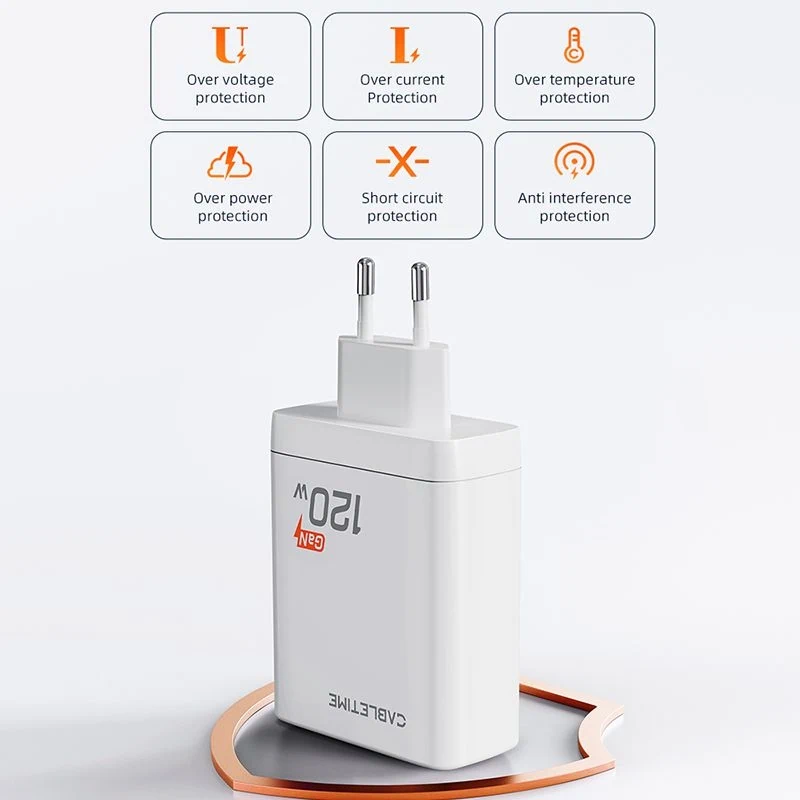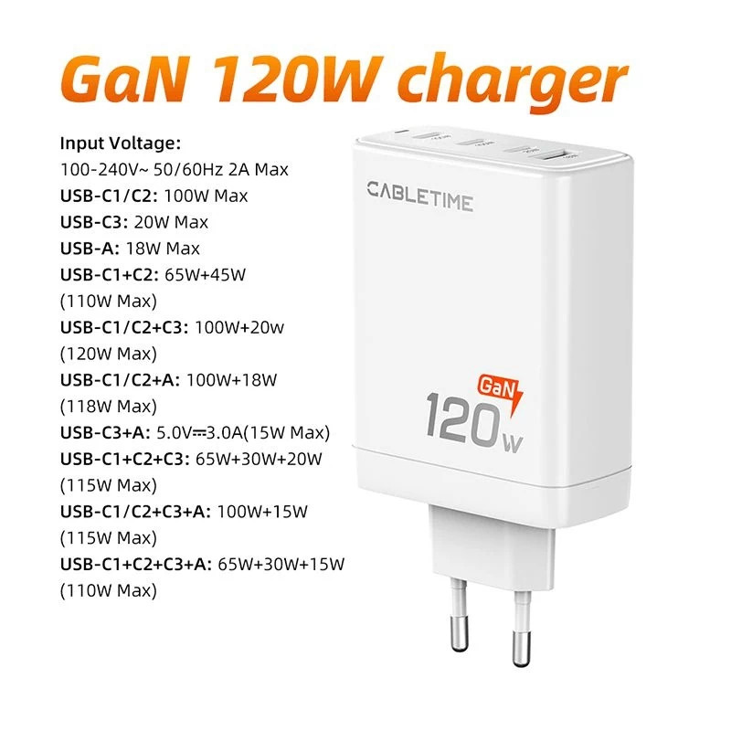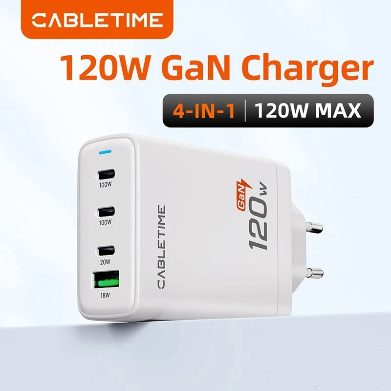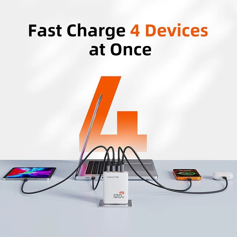 CableTime 120W GaN PD3.1 מטען קיר USB-C + USB-A ל־4 מכשירים